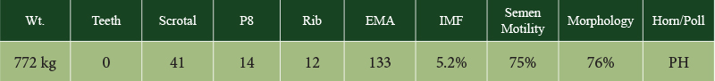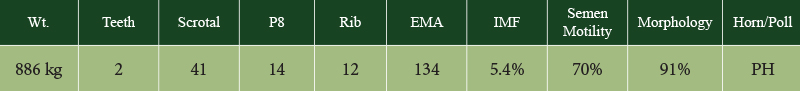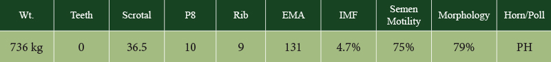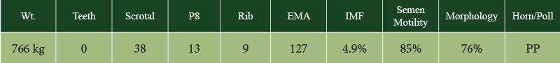 At 24 months of age, Bojangles weighed 827kg with an EMA of 142cms and a scrotal circumference of 42cms. He has grown into a massive bull with a kind and gentle nature.